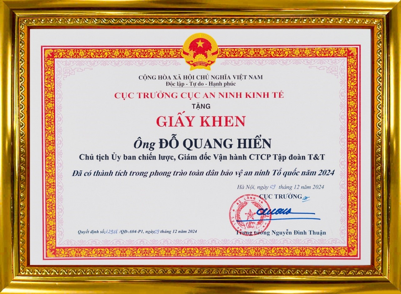 Vừa qua, Tập đoàn T&T Group và Chủ tịch Đỗ Quang Hiển vinh dự được Cục trưởng Cục An ninh Kinh tế (Bộ Công an) trao tặng Giấy khen vì đã có thành tích trong phong trào thi đua toàn dân bảo vệ an ninh Tổ quốc năm 2024. Đây là sự ghi nhận xứng đáng cho những đóng góp tích cực, bền bỉ và đầy trách nhiệm của cá nhân Chủ tịch Đỗ Quang Hiển và Tập đoàn T&T Group nói chung trong sự nghiệp phát triển kinh tế - xã hội của đất nước, đặc biệt là trong công tác đảm bảo an ninh, trật tự.